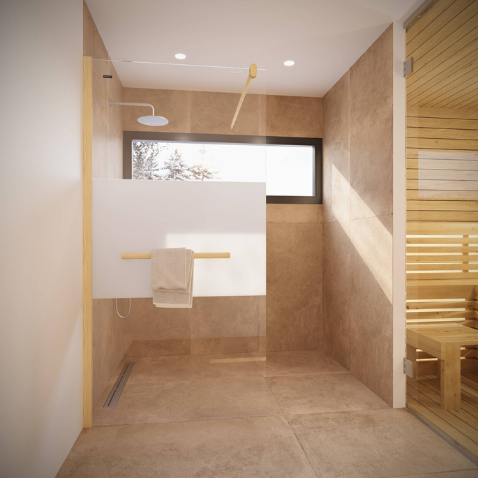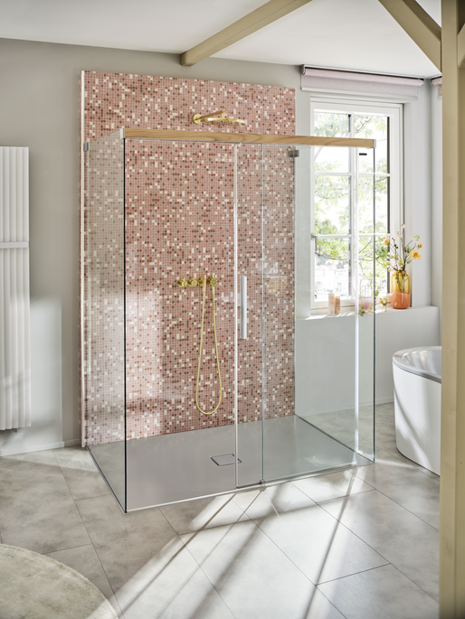 Die Viva Schiebetüre fügt sich durch die innovativen Führungsprofile in Ihren Raum besonders harmonisch ein. Als Akzent kann Echtholz oder PanElle in Glas- oder Steinoptik im Profil integriert werden. So entsteht mit der passenden PanElle Rückwand ein stimmiges Gesamtbild. Kontrastreich oder dezent - kombinieren Sie alle Vorteile einer modernen Schiebetür-Duschwand mit verblüffend großem Gestaltungsfreiraum.