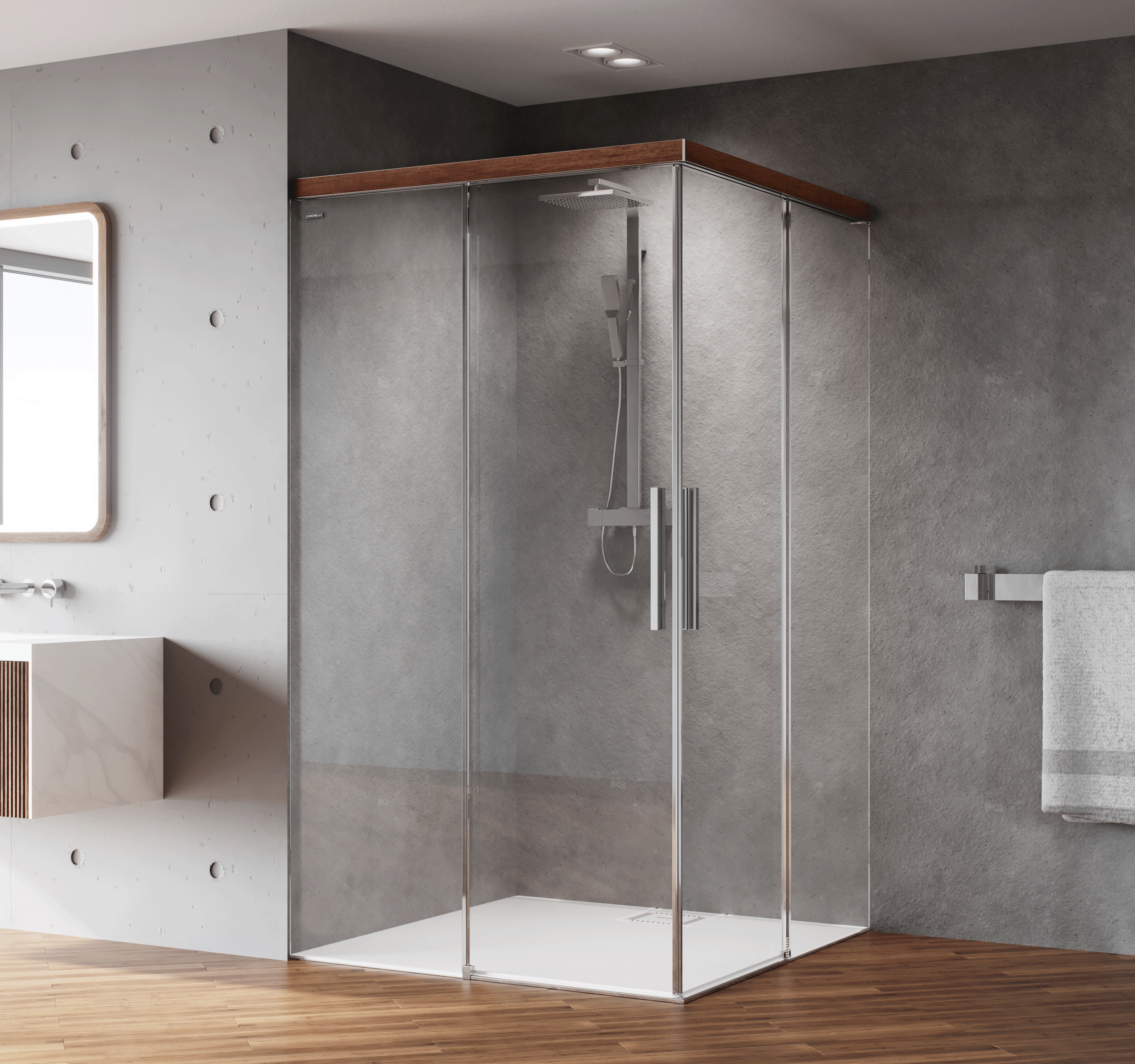 Die Viva Schiebetüre fügt sich durch die innovativen Führungsprofile in Ihren Raum besonders harmonisch ein. Als Akzent kann Echtholz oder PanElle in Glas- oder Steinoptik im Profil integriert werden. So entsteht mit der passenden PanElle Rückwand ein stimmiges Gesamtbild. Kontrastreich oder dezent - kombinieren Sie alle Vorteile einer modernen Schiebetür-Duschwand mit verblüffend grossem Gestaltungsfreiraum.