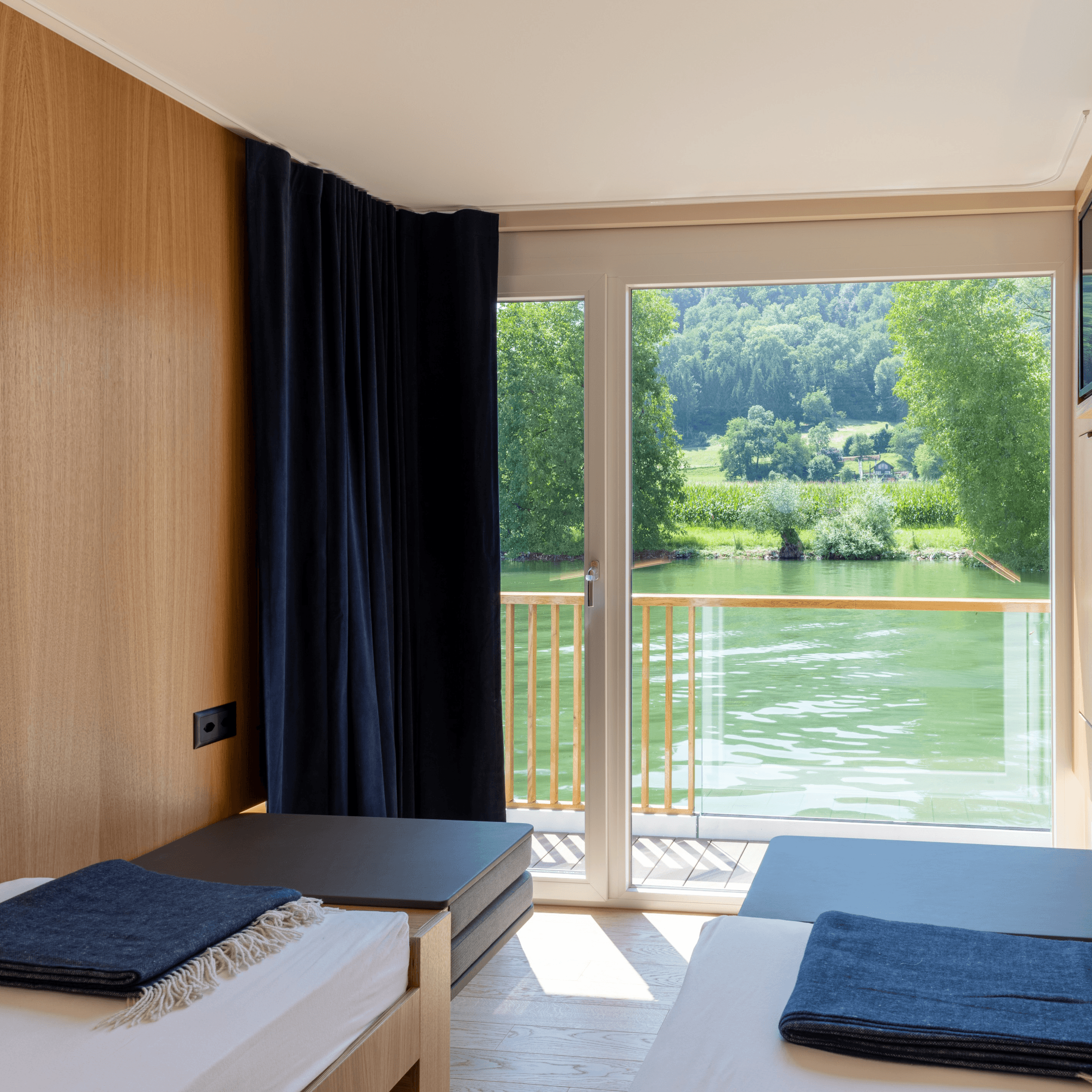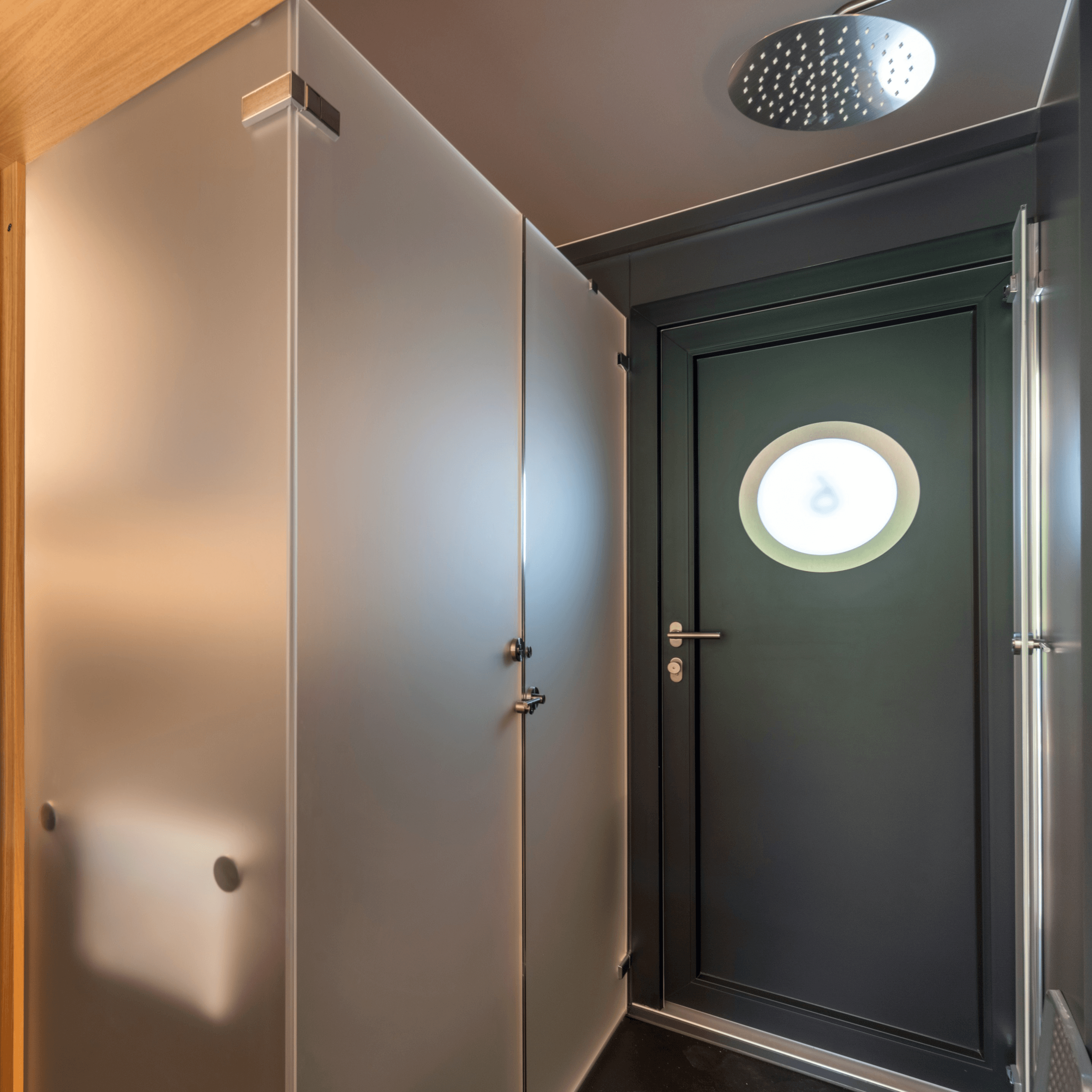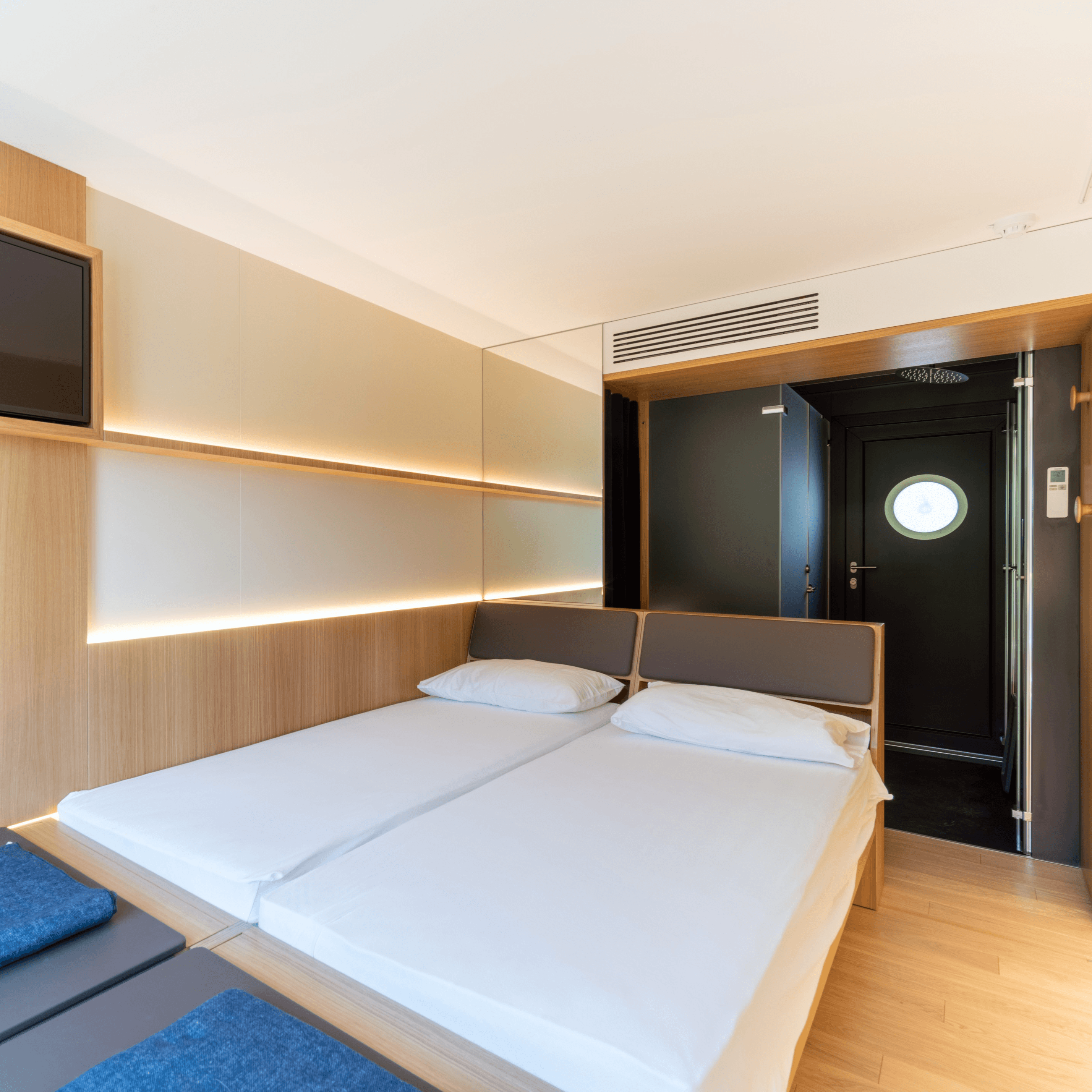 Le cabine si estendono su una superficie totale di 14 metri quadrati. Sono tutte dotate di un bagno privato con doccia, un televisore, una zona salotto, un frigorifero e un comodo letto matrimoniale. Per sfruttare al meglio lo spazio, il box doccia funge anche da ingressoe può essere aperto su entrambi i lati grazie aspeciali installazioni. Nella gamma di prodotti Viva è incluso il nostro trattamento per vetro CareTec Pro come standard, che semplifica notevolmente la pulizia.