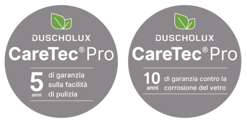 Il nuovo trattamento superficiale rimuove calcare e sporco dalla superficie intaccata. DUSCHOLUX garantisce l'effetto di imperlamento per cinque anni. I test hanno dimostrato una durata di CareTec® Pro ben superiore a dieci anni. L' effetto di "facilità di pulizia", come viene denominato nella normativa industriale, è definito dall'angolo di contatto delle gocce d'acqua. Applicato direttamente in fabbrica, il trattamento per vetro non solo protegge dal calcare ma anche dalla corrosione, un offuscamento del vetro dovuto ad alterazioni strutturali. Questo rende i box doccia rivestiti con CareTec® Pro particolarmente duraturi.