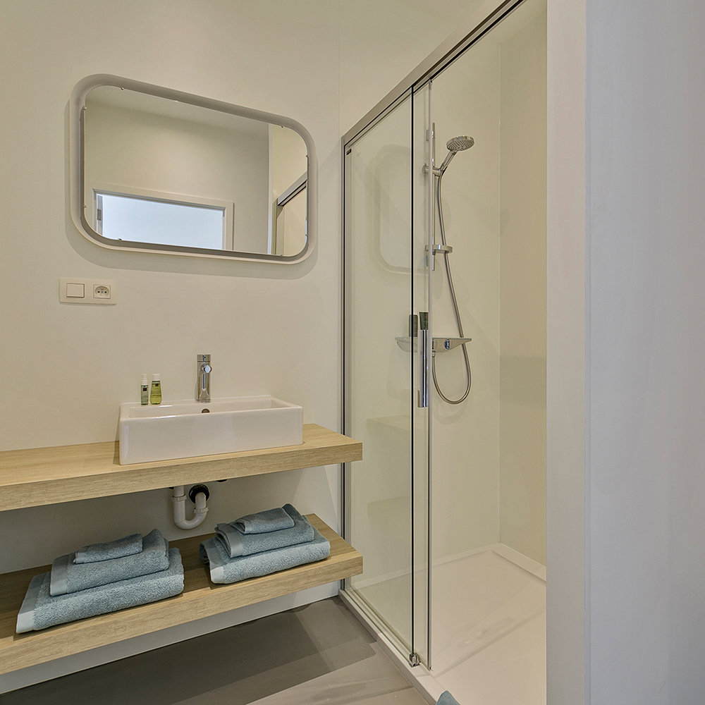 Se due delle camere presentano una parete doccia Walk-in Optima e altri due bagni presentano una porta scorrevole Bella Vita 3 collocata in una nicchia, l'ospite troverà il pezzo forte nel bagno del loft 1. Qui, oltre a una sauna, è stato creato un'installazione ad angolo su misura della Collezione 3C. La parete doccia ha un aspetto raffinato grazie al vetro in carbonio rifinito con DUSCHOLUX CareTec® Pro ed è particolarmente facile da pulire grazie alle cerniere interne a filo.